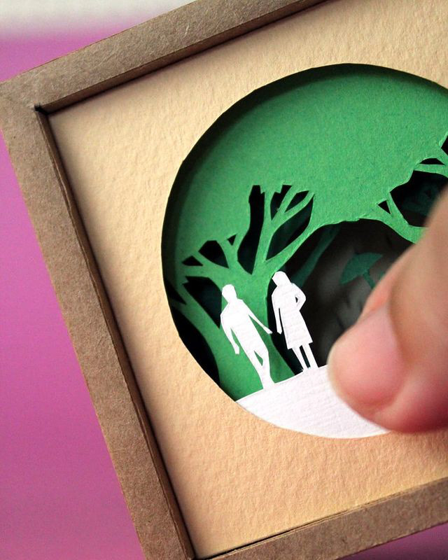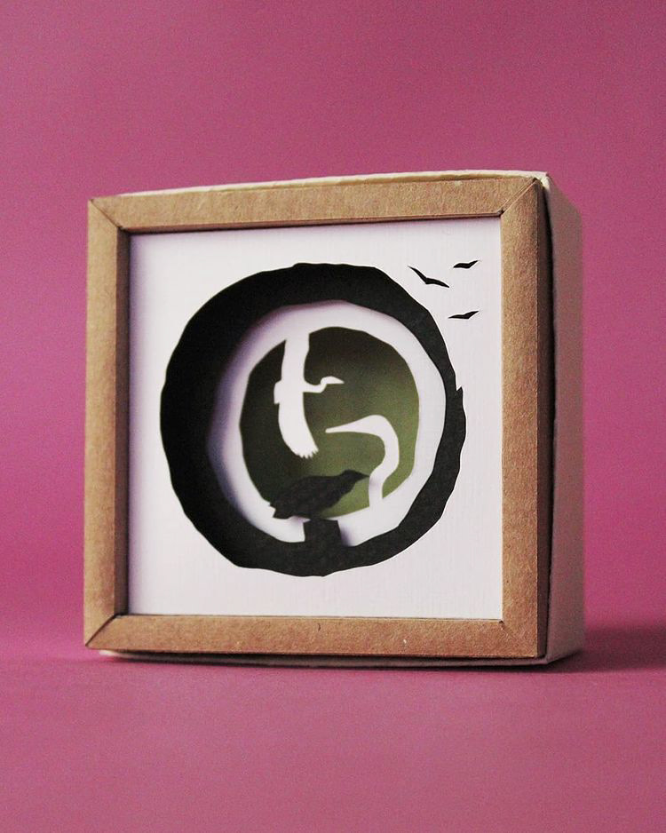 Caixas-cenários que reúnem cenários e símbolos icônicos de Belém do Pará: túnel de mangueiras com chuva da tarde, encontro de urubu e garça e janelas de casarões antigos.