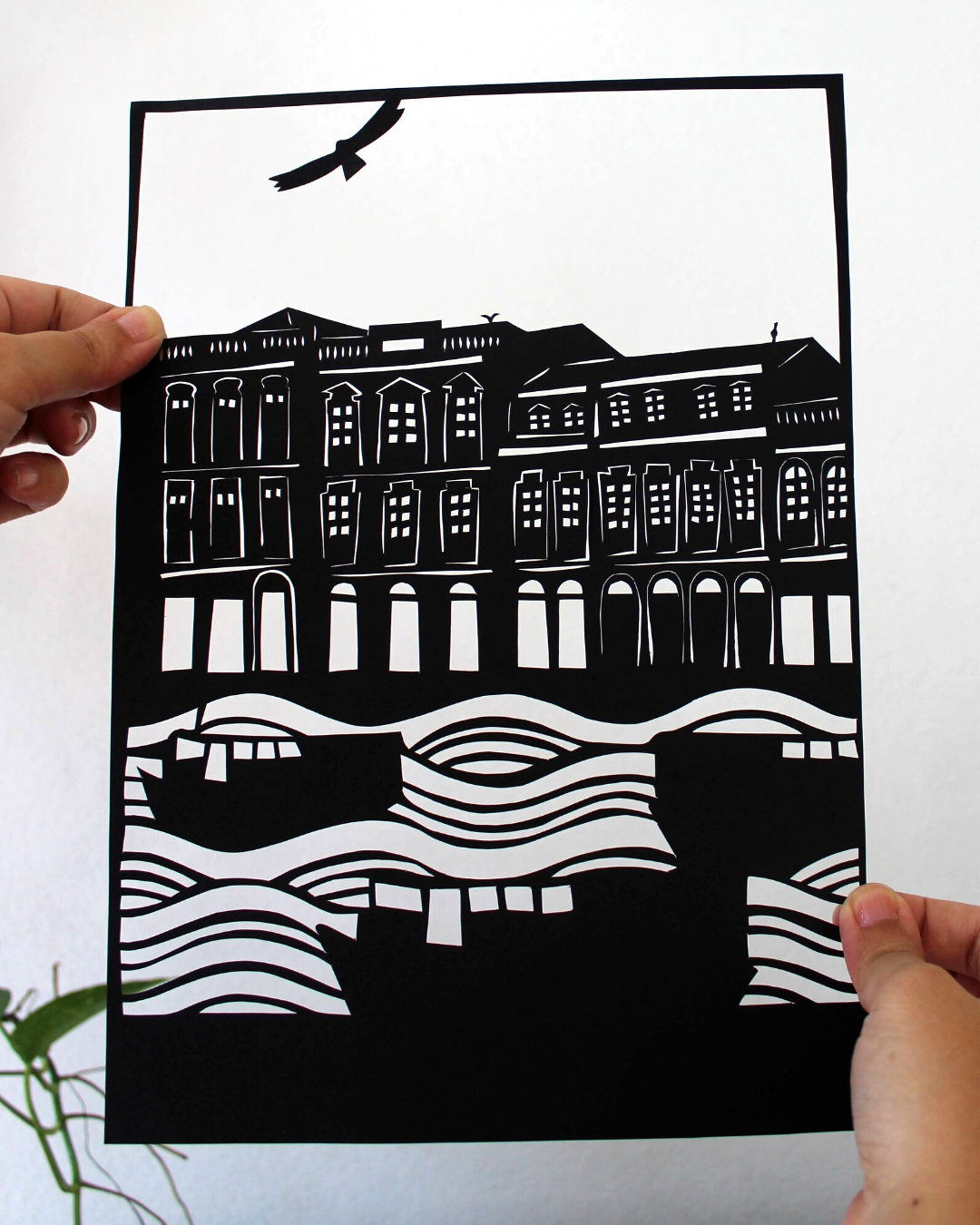 Papercut da paisagem da Pedra do Peixe, que integra o Complexo do Ver-o-Peso, em Belém do Pará.
